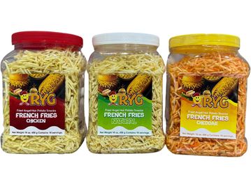 Crujiente papa cabello de ángel frita, lista para consumir en presentaciones en tarro. Disponible en tres sabores irresistibles: Pollo, Natural y Queso Cheddar.